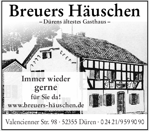 Am Herzen liegt Armin Bongartz im Moment auch noch ein anderes Projekt: Das Breuers Häuschen wurde nämlich 1800 erstmals als Gaststätte urkundlich erwähnt, begeht in diesem Jahr also seinen 222. Geburtstag. Aus diesem Grund möchte er im Oktober ein historisches Buch herausbringen, in dem Fotos, Speisekarten und Erinnerungen von Zeitzeugen die Geschichte des Hauses in Gürzenich erzählen. Viele Stammkunden haben ihm hier schon die tollsten Erinnerungsstücke vorbeigebracht oder Geschichten und Anekdoten erzählt, die unbedingt in ein solches Buch gehören. Auch der Heimatbund Gürzenich und das Stadtmuseum Düren unterstützen ihn dabei. Wer hierzu etwas beitragen möchte, kann sich in der Gaststätte melden oder sich per E-Mail an Breuers_Geschichten@gmx.de wenden. Breuers Häuschen, Valencienner Str. 98, 52355 Düren, Telefonnummer: 02421/9599090, armin.bongartz50@gmail.com, www.breuers-häuschen.de.